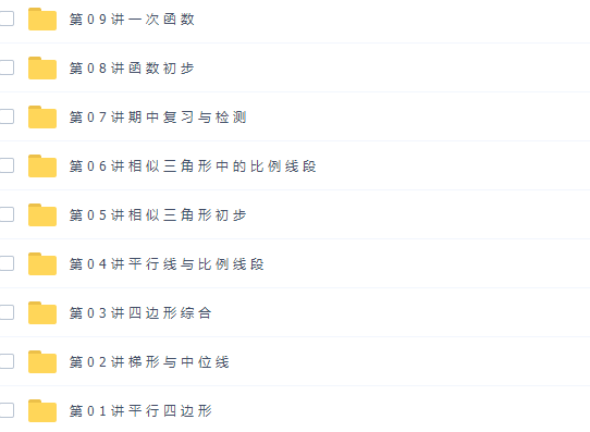 此课件来自91好课,林东初一数学春季创新班完结。此课件主要知识点包括:平行四边形、梯形与中位线、四边形综合、平行线与比例线段、相似三角形初步、相似三角形中的比例线段、期中复习与检测、函数初步、一次函数、反比例函数、函数综合、二次函数初步、组合问题、期末测试。