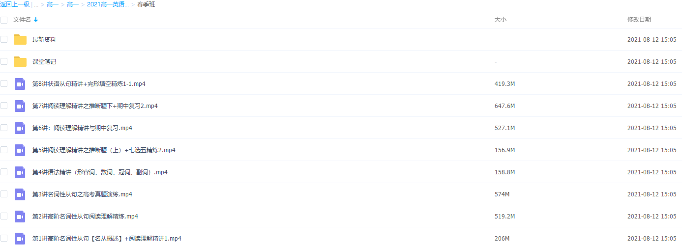 此课程来自于高途课堂,2021年春季高一英语郭艺春班。课程知识点包括状语从句精讲+完形填空精炼、阅读理解精讲、语法精讲(形客词。数词、冠词、副词)、高阶名词性从句和高考真题演练等视频。她的课程安排基本上是阅读理解、语法、写作轮着来的,希望对大家有所帮助!