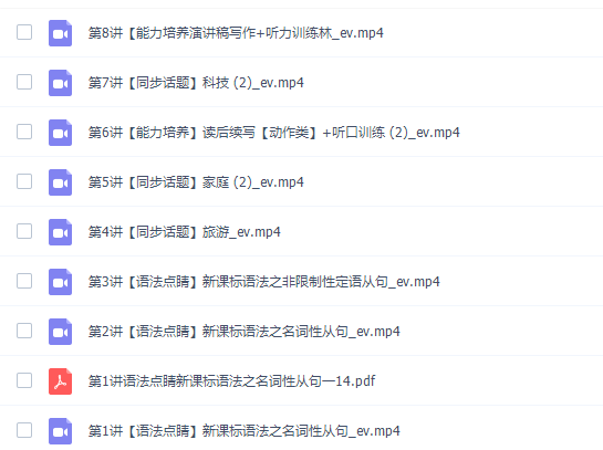 此课件来自高途课堂网校,王双林2022寒假高一英语寒假系统班8讲完结。此课件主要知识点包括:新课标语法之名词性从句、新课标语法之非限制性定语从句、旅游、家庭 、读后续写(动作类)、听口训练、科技 、能力培养演讲稿写作。